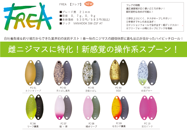 製品名:Khor FREA(フレア) ■サイズ:全長21㎜、全幅8.8㎜ ■ブレード重量:0.7g ■フック:VANFOOK SW21-F#7 ■リング:VANHOOK #0